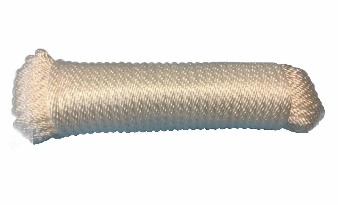 Nylon smooth white rope recommended for securing boats, cargo and furniture.