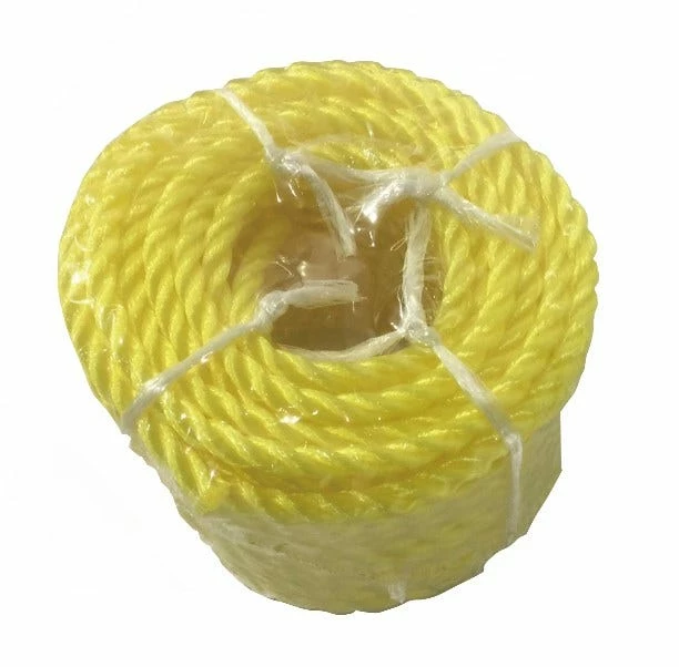 Twisted polypropylene rope yellow, twice as strong as manila, resistant to rot, mildew, marine growth and petroleum products.