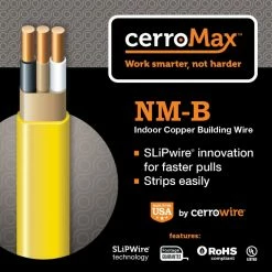 Cerrowire CerroMax™ Copper NM-B Wire with SLiPwire™ technology is a 600-Volt, grounded, jacketed electrical wire used primarily in residential housing, including branch circuits for outlets, switches, etc. It may be installed in both exposed and concealed work in normally dry locations, and in air voids of masonry block or tile walls which are not subject to excessive moisture or dampness. It can be installed in locations with temperatures up to 90˚C, but with the ampacity limited to that of 60˚C conductors. The added circuit is for use primarily in indoor residential wiring for branch circuits supplying outlets located in bedrooms and other areas.