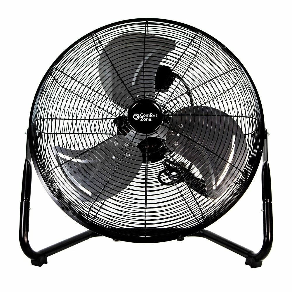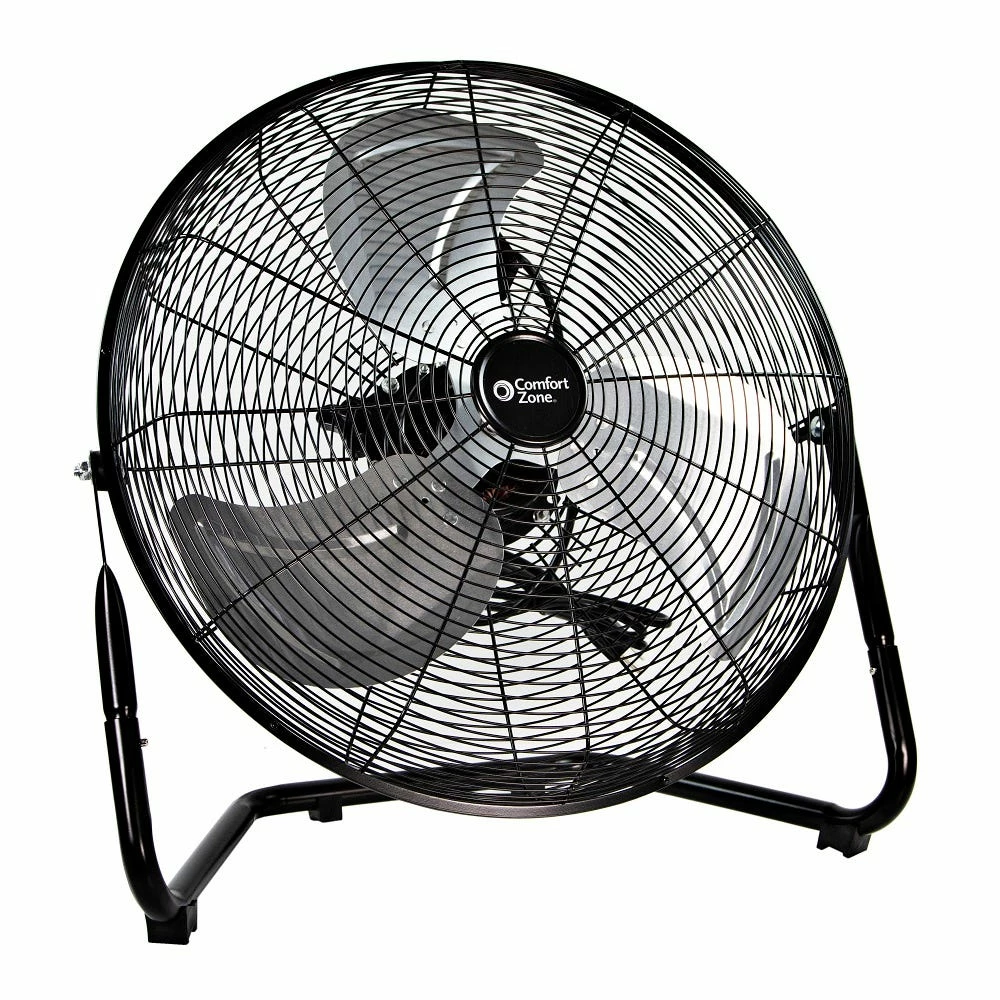 Keep your home or office space cool and comfortable with this 3-speed floor fan from Comfort Zone. This low-profile cradle fan sits conveniently on the floor, where you can choose from three speed settings to modify the velocity of air output to suit your space in any season. For targeted cooling, simply position the head of the fan using the adjustable 180-degree vertical tilt to direct the powerful airflow where it’s needed. The high-velocity house fan features all-metal construction for lasting durability and rubber feet that provide added stability and minimize vibration. A grounded cord set meets OSHA requirements and the metal safety grill offers protection from moving blades. Neutral black coloring blends seamlessly with most decors, making this a practical floor fan for office or home use. This high-velocity floor fan is equipped with a convenient carry handle that makes it easy to transport it from room to room.