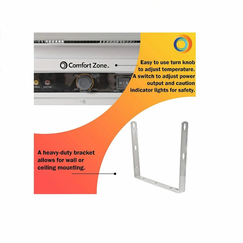 Create a comfortable environment with this Comfort Zone industrial heater in your workspace or garage. This ceiling-mount heater distributes heat across a wide area to keep your space comfortable. Integrated vent plates angle for adjusted efficient airflow. It also features a power and caution indicator lights for easy operation and monitoring. An overload switch provides added safety and protection against electrical overload. All Comfort Zone industrial products are designed and tested to meet global quality standards including UL, ETL, SAA, CE, NOM.