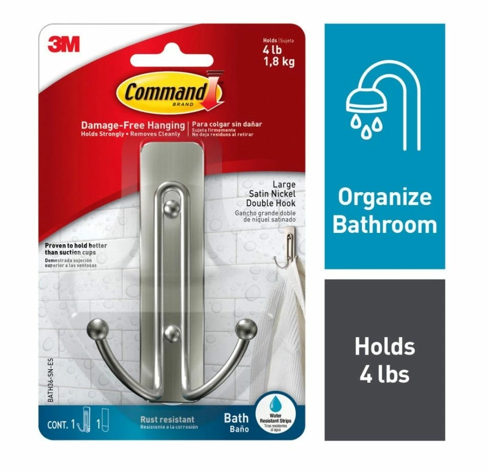 The Command™ Bath Hook with a water resistant strip allows you to keep your bathroom organized both inside and outside of the shower. The hook sticks to many surfaces, including glass, mirror, tile, fiberglass, wood and painted surfaces. It adheres firmly and comes off leaving no holes or sticky residue, providing a great alternative to unsightly, unreliable suction cups and damaging screws and nails. Moving the hook for reorganization is as simple as applying a refill, waterproof Command™ Strip!