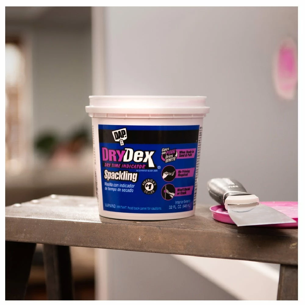DAP DryDex Spackling provides a unique dry time color indicator that verifies when the patched surface is dry and ready to be sanded and painted, thus providing a smoother finished surface in a shortened amount of time. DryDex Spackling may be used to fill holes and cracks in surfaces such as drywall, plaster, wood, brick and stone. Its ready-to-use formula spreads easily for fast, professional repairs that will not crack, crumble or flake. DryDex dries hard, sands easily and can be painted.