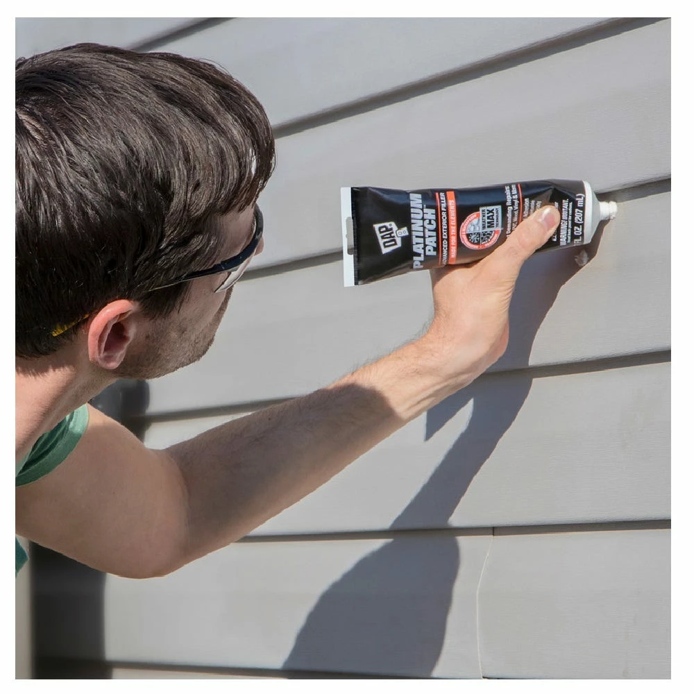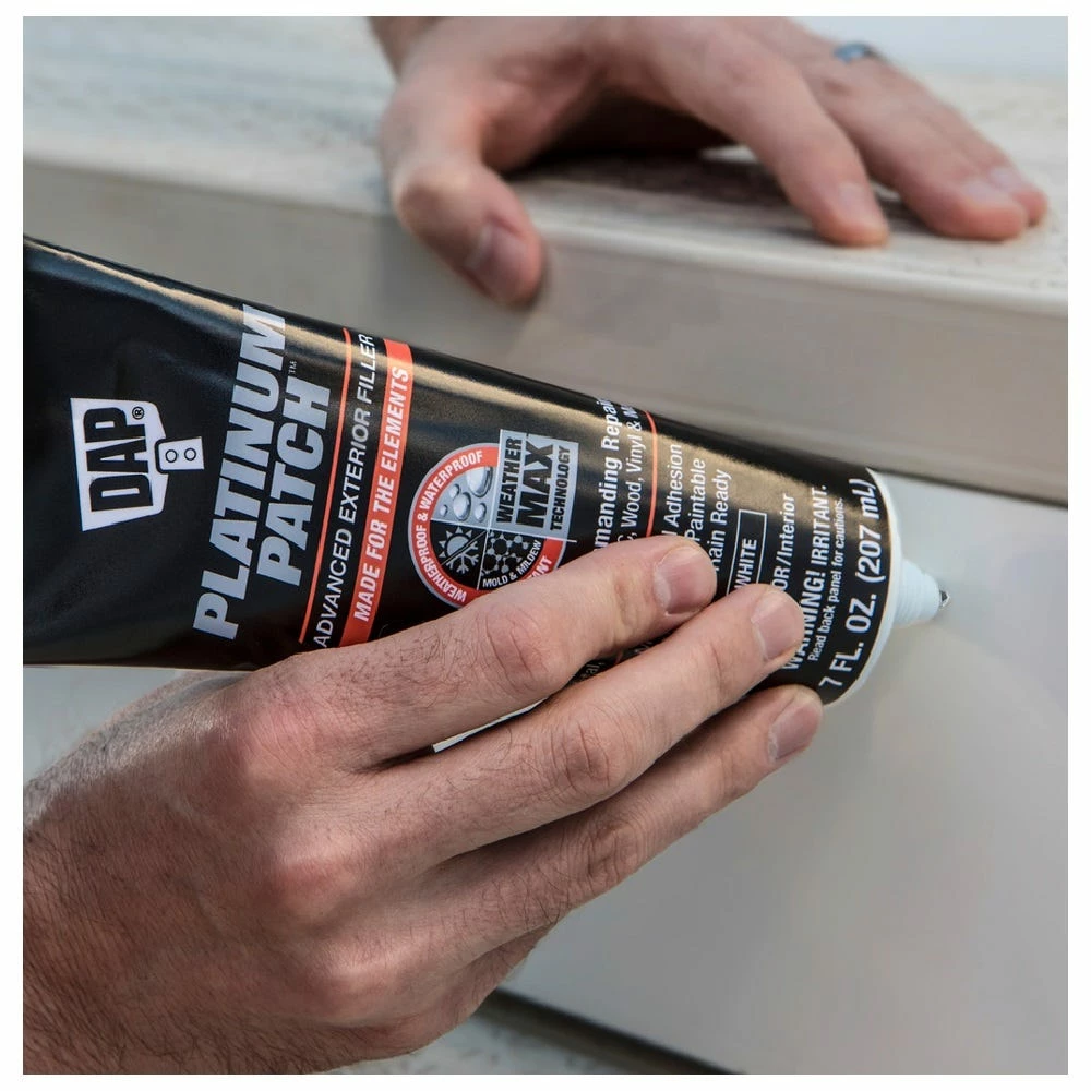 DAP Platinum Patch Advanced Exterior Filler is formulated with innovative WEATHER MAX Technology for long-lasting, all weather protection. Platinum Patch provides exceptional weatherproof protection that prevents discoloration, cracking and crumbling. The tough hydrophobic surface provides a waterproof repair that won’t swell, soften, blister or breakdown and it is mold, mildew & algae resistant making it perfect for areas with continuous exposure to the elements. It has strong multi-material adhesion to tough porous and non-porous materials making it ideal for exterior applications such as the installation, finishing or repairing of fiber cement siding, PVC trim board, vinyl siding, metal, composite, concrete, brick, wood and more.