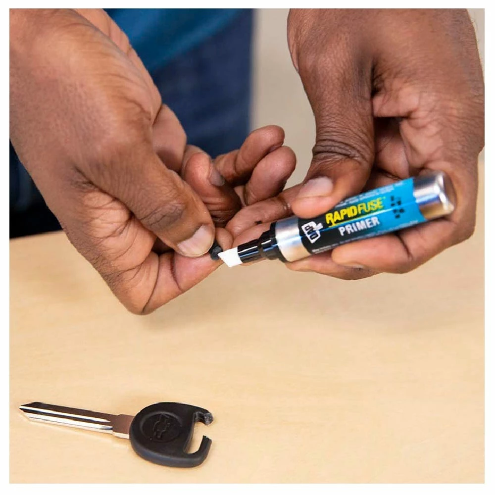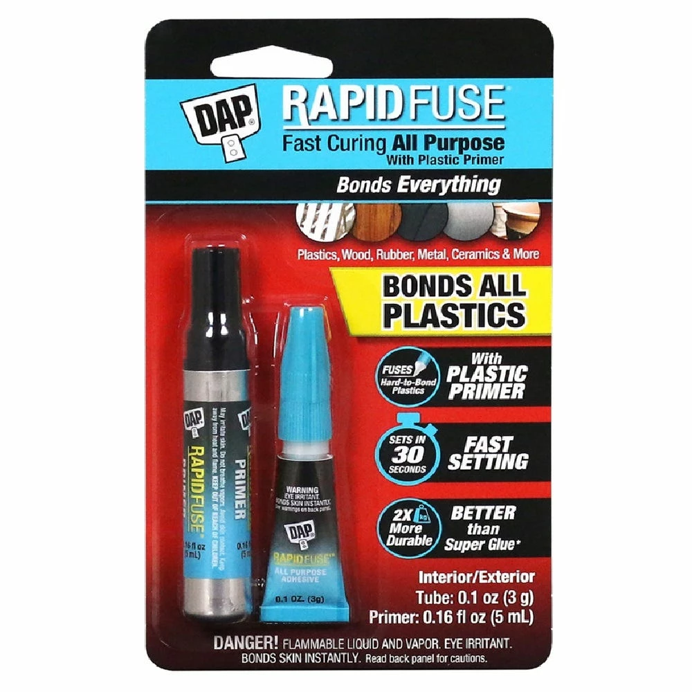 DAP RapidFuse Fast Curing All Purpose Adhesive with Plastic Primer is the ideal solution for all of your plastic repairs. Easy to use! Sets in 30 seconds, cures in 30 minutes. Works on all common household materials and all plastics – even hard-to-bond plastics with the use of the plastic primer. Plus, unlike traditional super glues, the bond won’t become brittle while delivering long-lasting durability. The bond is clear – no expanding foam, no dripping glue, no mess. Clean-up with soap & water. Indoor & outdoor use.
