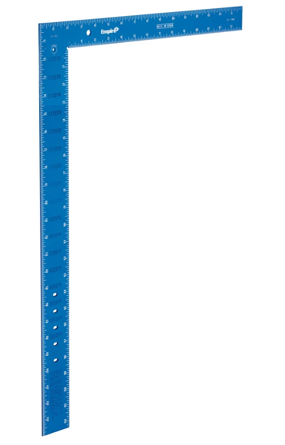 The Empire® 16 in. x 24 in. True Blue® laser etched framing square (E1190) has permanent high-visibility laser markings that won’t wear after heavy use. The square has ARC-SCRIBEâ„¢ which is the best solution for marking radii. The durable anodized lightweight aluminum framing square will not rust or corrode and features laser etched graduations at 1/8 in., 1/10 in., 1/12 in., and 1/16 in. for superior readability in any light condition.