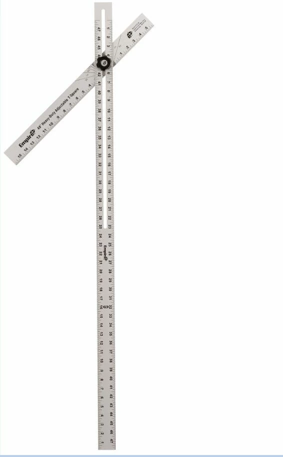 The Empire 419-48 48 in. heavy-duty adjustable t-square features super heavy duty 1/4 in. thick construction for everyday jobsite use. The adjustable head quickly matches 30, 45, 60, and 75 degree angle. An anodized aluminum finish with easy to read numbers allows for quick reference of multiple measurements.
