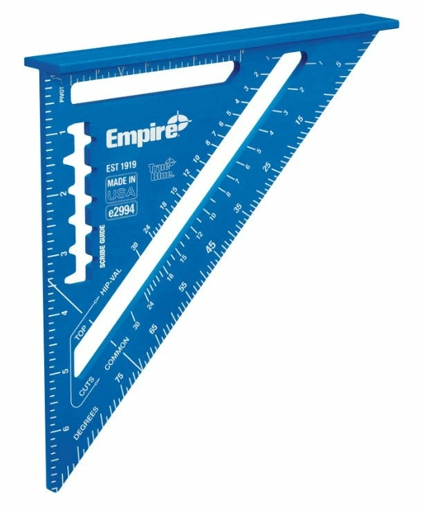 The Empire® True Blue® laser etched 7 in. Rafter square (E2994) has permanent laser markings for superior readability in any light condition. Scribe-guideâ„¢ precision scribe notches allow for easily marking parallel lines on lumber. Hi-visibility laser etched markings won’t fade after heavy use. The rafter layout square is made from a durable anodized aluminum that is more durable than diecast and will not rust or corrode. The Empire rafter square has conversion tables for common applications. The square has an increased heel width that is up to 15% wider than leading competitors for increased stability on all job site material.
