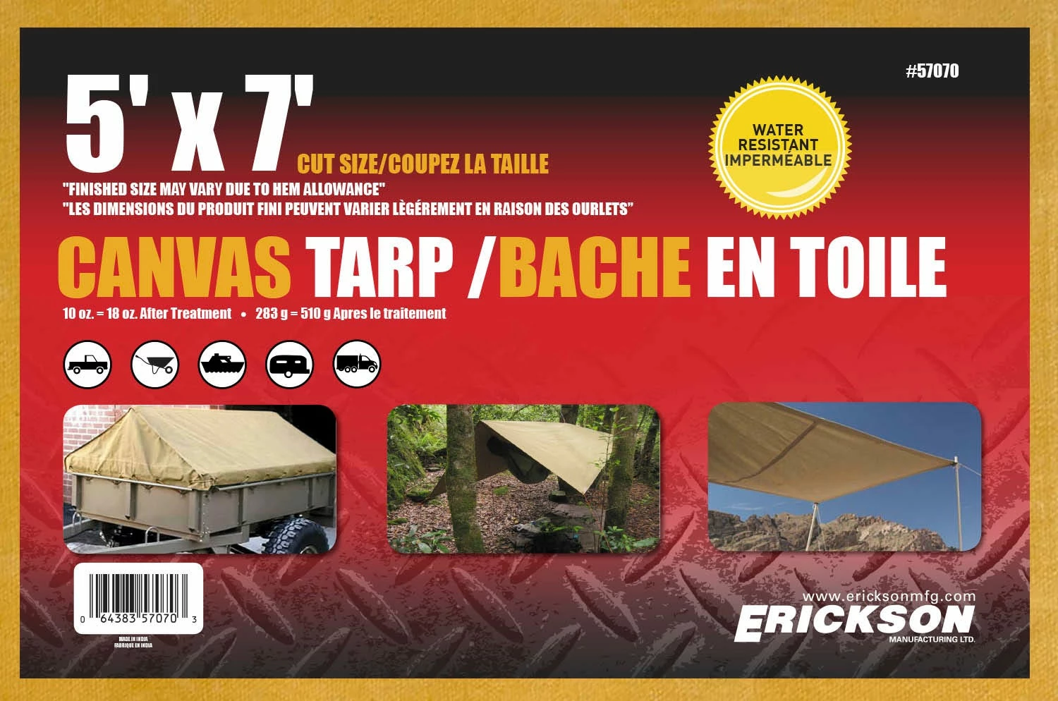 Erickson 57070 Tan cotton heavy duty 5′ wide x 7′ long canvas tarp. The 100% cotton canvas makes for a strong, durable, breathable cover. This cotton canvas has been wax processed to be water-resistant and protect against mildew. Tarp also features strong rust-resistant grommets spaced approximately every 3′ apart to provide lots of tie-down points. As a leader of tie-down and towing products in North America, Erickson strives to provide the safest products available with the consumer in mind. Tie it. Tow it. Load it. Count on Erickson.