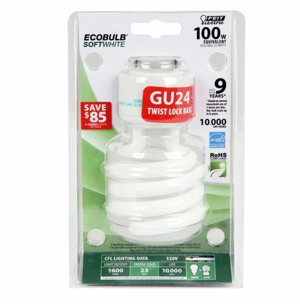 - The BPESL23TM/GU24 Feit Electric 100W Mini Twist GU24 Base CFL 2700K soft white light is non-dimmable and will replace a 100-watt equivalent incandescent bulb