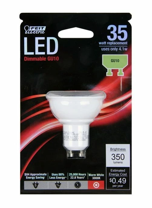 - This Feit Electric 35-watt equivalent traditional glass MR16 flood LED light bulb has a GU10 base