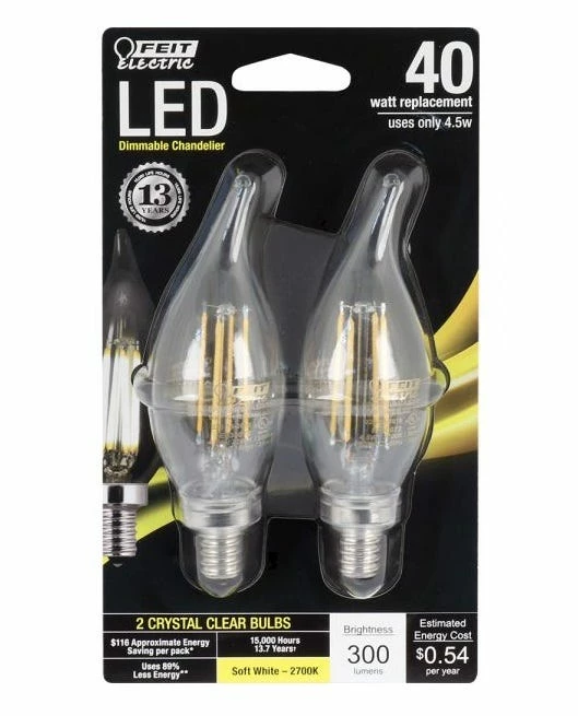 - Combining the traditional look of chandelier lighting with the advantages of LED technology, these Feit Electric chandelier bulbs are made with an LED exposed filament wrapped in a glass housing