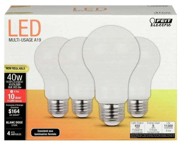 These 6 Watt Non-Dimmable LEDs replace 40 Watt incandescent bulbs. They have an average life of 11,000 hours, they are RoHS Compliant and mercury free.