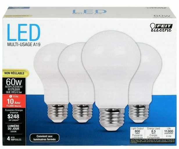 - Enjoy all the benefits of advanced LED energy-saving technology with the Feit Electric A800/850/10KLED/4 4-Pack A19 60W LED Light Bulbs