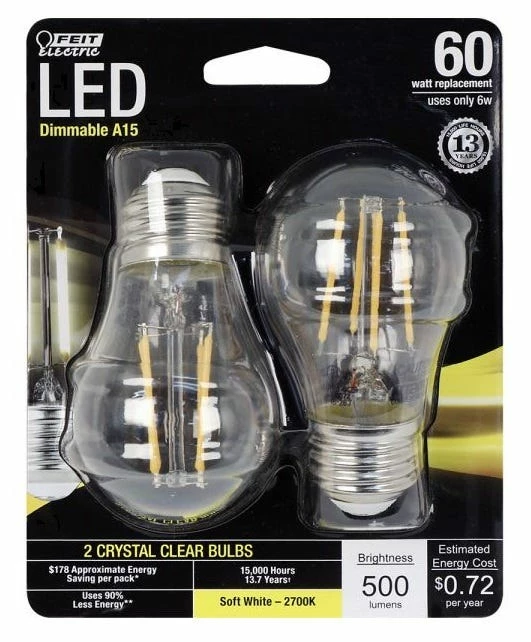 - Enjoy all the benefits of advanced LED energy-saving technology with the Feit Electric BPA1560/827/LED/2 2-Pack  60W A15 Crystal Clear LED Light Bulbs