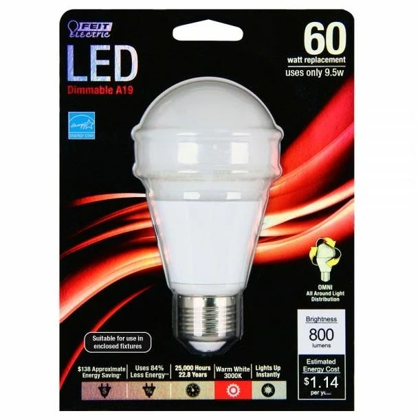 - These Feit Electric A19 bulbs have an average life of 25,000 hours / 22.8 years are RoHS compliant and 100% mercury free