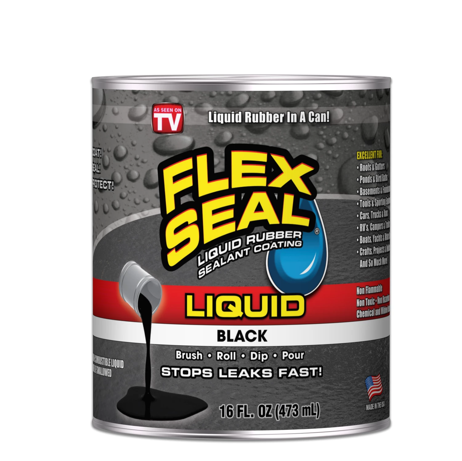With Flex Seal Liquid, you can Coat, Seal, Protect and Stop Leaks Fast. It is Liquid Rubber in a can. Brush, Roll, Dip or Poor it, Flex Seal liquid is a thick Liquid that dries to a flexible Water Tight Rubberized coating., Creates a flexible rubber barrier that blocks out air, water and moisture. It is non toxic, non flamable, no harmful vapors, UV and mildew ressistant.