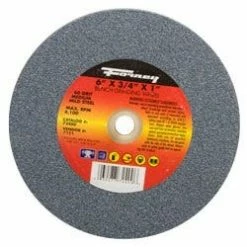 6″ X 3/4″ X 1″ Arbor, 36 Grit, Type 1 bench grinder wheel. Max RPM 4,100. Vitrified bond, aluminum oxide. Designed for most stationary bench grinders. For general grinding and sharpening applications on mild steel. 1″ arbor hole with adapters for 1/2″, 5/8″, and 3/4″ arbors. Not for carbide applications.