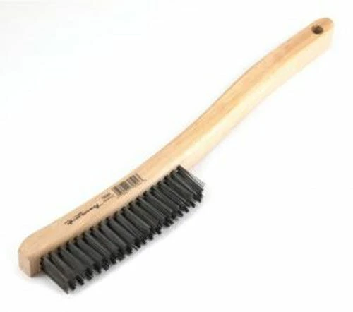 Curved (Wood) Handle Carbon Steel Wire Scratch Brush. 13-3/4″ overall length (OAL) x .014″ carbon steel wire x 3×19 rows.