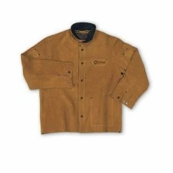 Genuine split cowhide, long sleeved large welding jacket with heavy duty Kevlar stitching and riveted pockets.