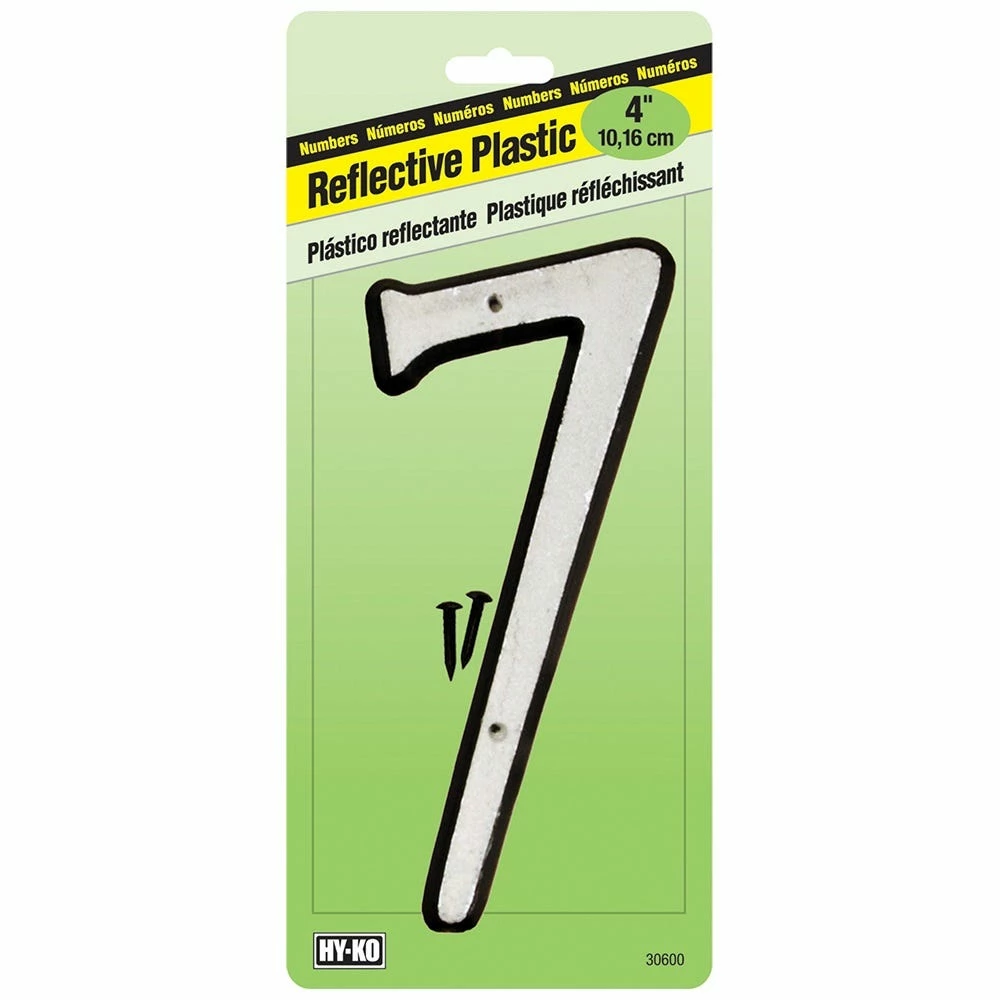- Black plastic with white reflective numeral.