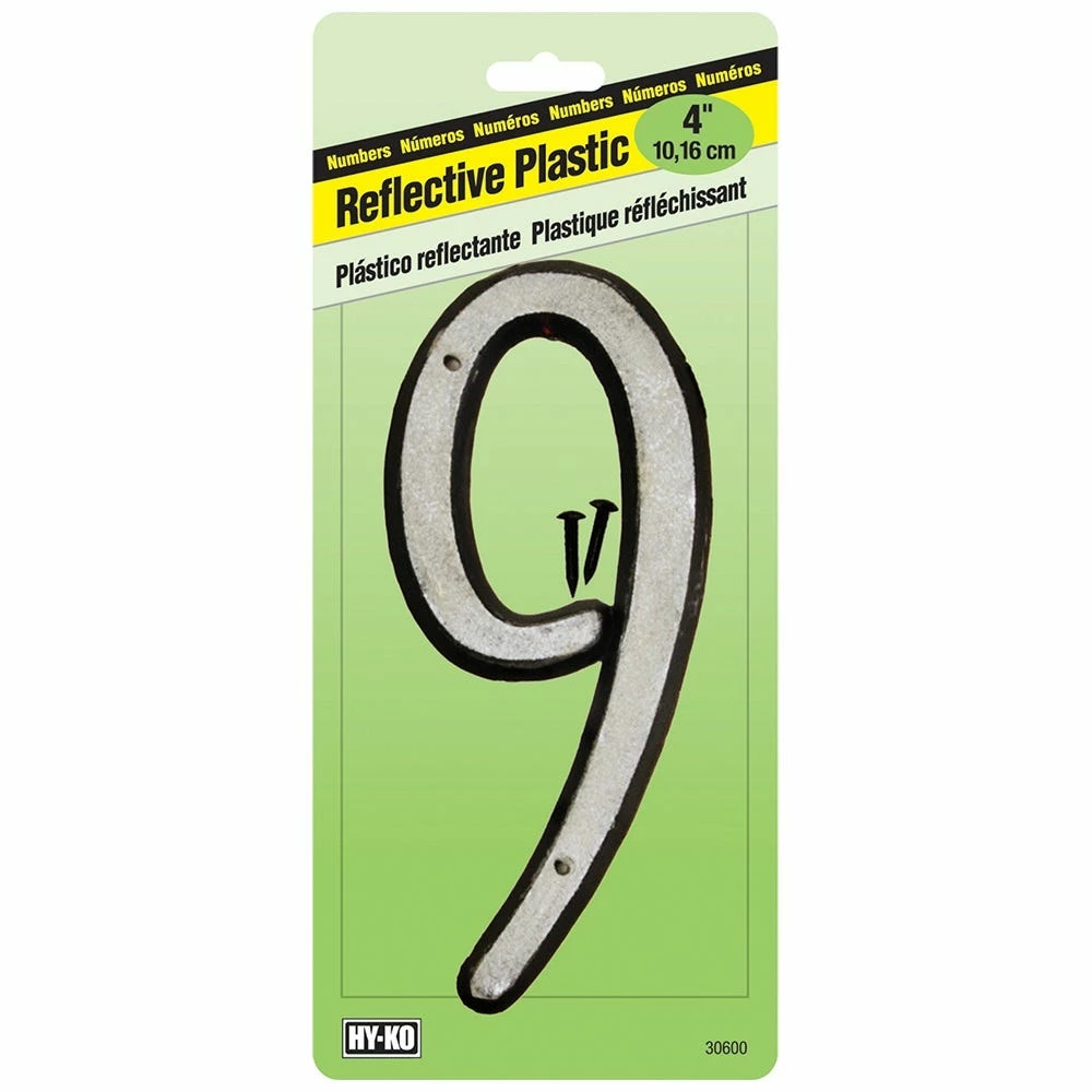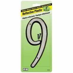 - Black plastic with white reflective numeral.