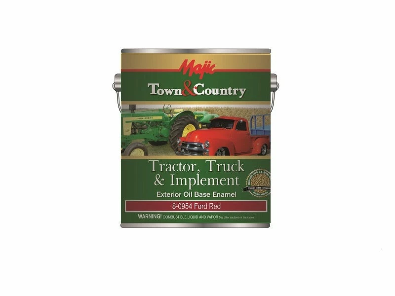 Majic Town & Country Tractor, Truck & Implement Enamel is a durable heavy-duty alkyd enamel specially formulated for excellent adhesion, and resistance to weathering and corrosion. It may be applied by brush or spray, and dries to a high gloss finish. For use on iron, steel, aluminum and properly primed galvanized metal.