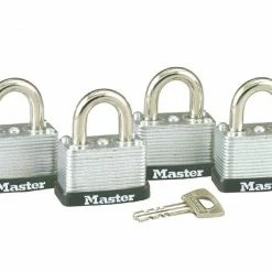 The Master Lock No. 3009D Laminated Padlock features a 1-1/2in (38mm) wide laminated steel body for strength and reliability. The 1/4in (6mm) diameter shackle is 5/8in (16mm) long and made of steel, offering strong resistance to cutting. The warded single locking lever mechanism minimizes jamming from dirt and grime. The Limited Lifetime Warranty provides peace of mind from a brand you can trust.