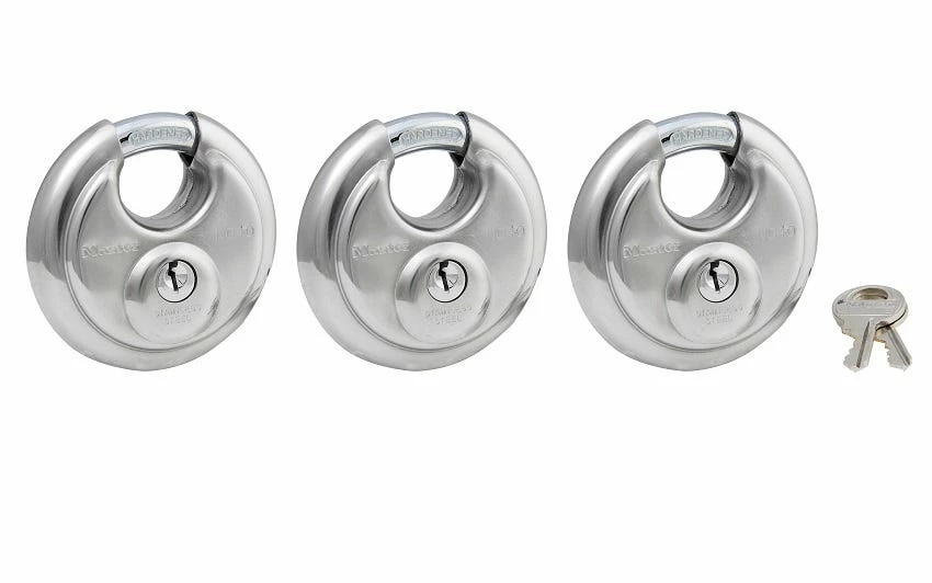 The Master Lock No. 40TRI Discus Padlock features a 1-9/16″ (70mm) wide stainless steel body for maximum strength, reliability and corrosion resistance. The fully shrouded design minimizes shackle exposure and protects against bolt cutter attacks. The 3/8″ (10mm) diameter shackle is 5/8″ (16mm) long and made of hardened steel, offering extra resistance to cutting and sawing. The 4-pin cylinder prevents picking and the dual locking levers provide resistance against prying and hammering. The Limited Lifetime Warranty provides peace of mind from a brand you can trust.