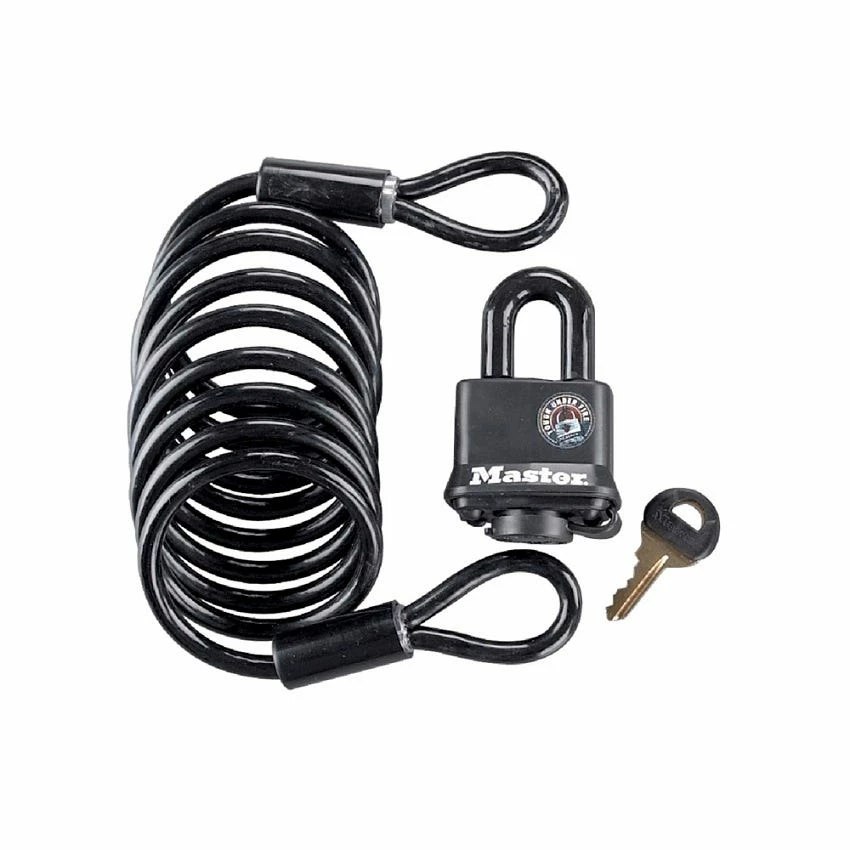 The Master Lock No. 613DAT features a 6ft (1.8m) long x 1/4in (6mm) diameter braided steel looped end cable and 1-9/16in (40mm) wide covered laminated steel body padlock. The braided steel cable design offers additional strength and flexibility. The protective vinyl coating protects against scratches. The padlock features a weather resistant thermoplastic shell provides outdoor protection against moisture, dirt and grime. The 4-pin cylinder prevents picking and the dual locking levers provide resistance against prying and hammering. The Limited Lifetime Warranty provides peace of mind from a brand you can trust.Â