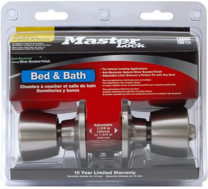 The Master Lock No. TUO0315 features a tulip style knob with six-way adjustable latch to fit all doors with 2-3/8in or 2-3/4in backset, square, rounded corners, or drive-in. This knob offers ANSI GRADE 3 performance for interior locking applications. The satin nickel finish provides a sleek appearance. The Ten Year Limited Warranty provides peace of mind from a brand you can trust.