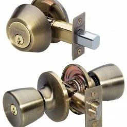 The Master Lock No. TUCO0605 features a keyed alike tulip style knob and single cylinder deadbolt, with interior thumb turn. The six-way adjustable latch fits all doors with 2-3/8in or 2-3/4in backset, square, rounded corners, or drive-in. The deadbolt is four way adjustable for 2-3/8in or 2-3/4in backset, square, or rounded corners. This knob and deadbolt combo pack is ANSI GRADE 3 and designed for exterior door applications. The antique brass finish provides a sleek appearance. The Ten Year Limited Warranty provides peace of mind from a brand you can trust.