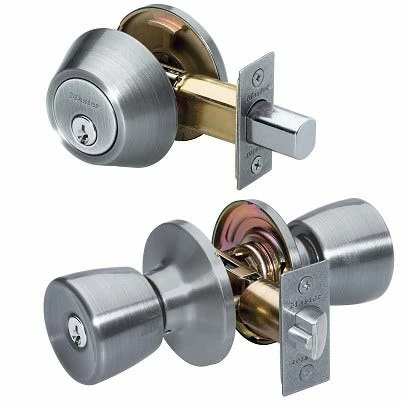 The Master Lock No. TUCO0615 features a keyed alike tulip style knob and single cylinder deadbolt, with interior thumb turn. The six-way adjustable latch fits all doors with 2-3/8in or 2-3/4in backset, square, rounded corners, or drive-in. The deadbolt is four way adjustable for 2-3/8in or 2-3/4in backset, square, or rounded corners. This knob and deadbolt combo pack is ANSI GRADE 3 and designed for exterior door applications. The satin nickel finish provides a sleek appearance. The Ten Year Limited Warranty provides peace of mind from a brand you can trust.