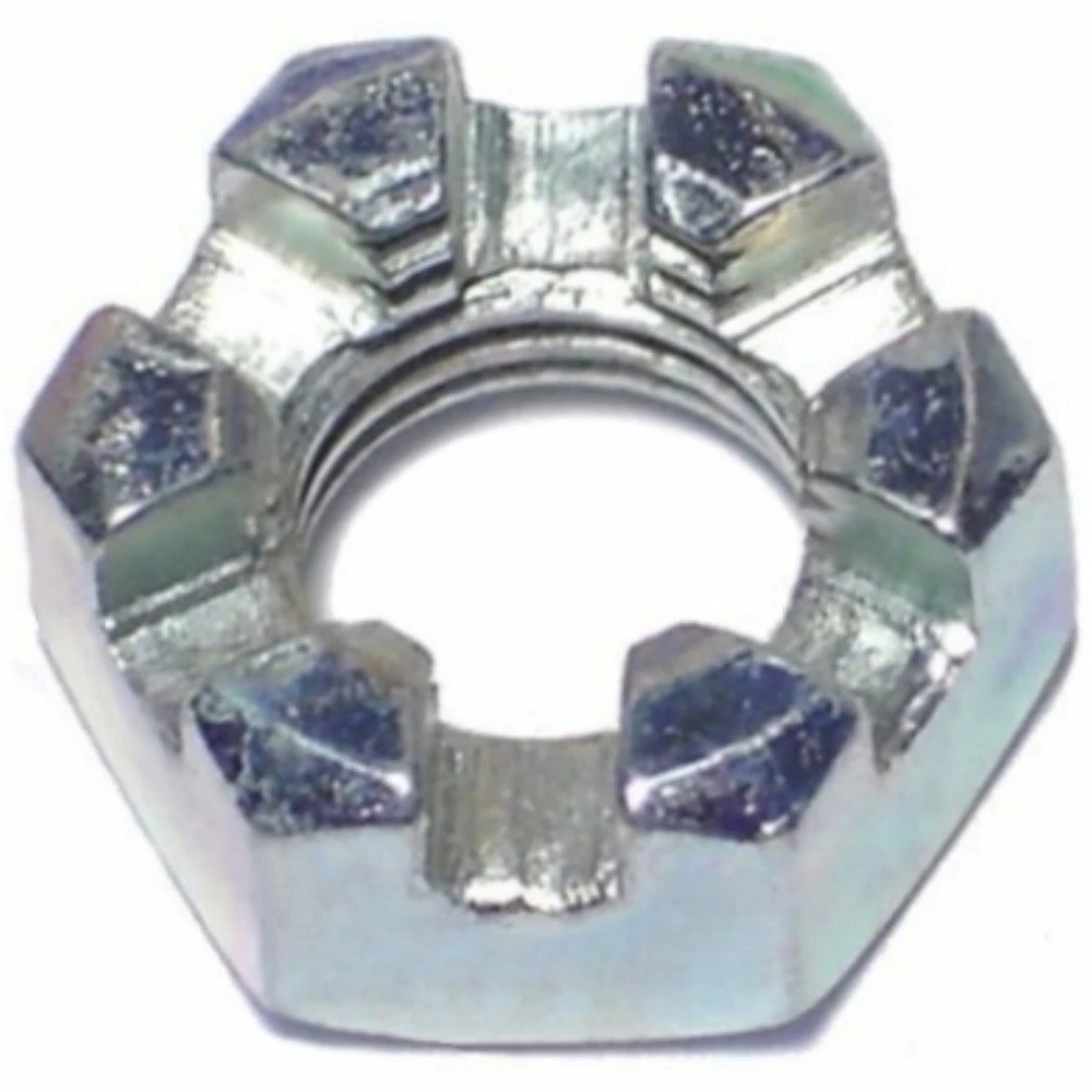 - A castle nut is a hex nut with slots (notches) cut into one end. The slots allow for a cotter pin to be installed between them and through the bolt/stud the nut is being threaded onto. The cotter pin prevents the nut from working loose. Often found in automotive applications like ball joints and tie rod ends.