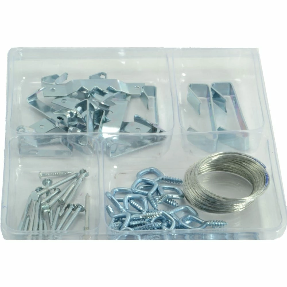 - A picture hanging kit with an assortment of hard wall picture hangers.