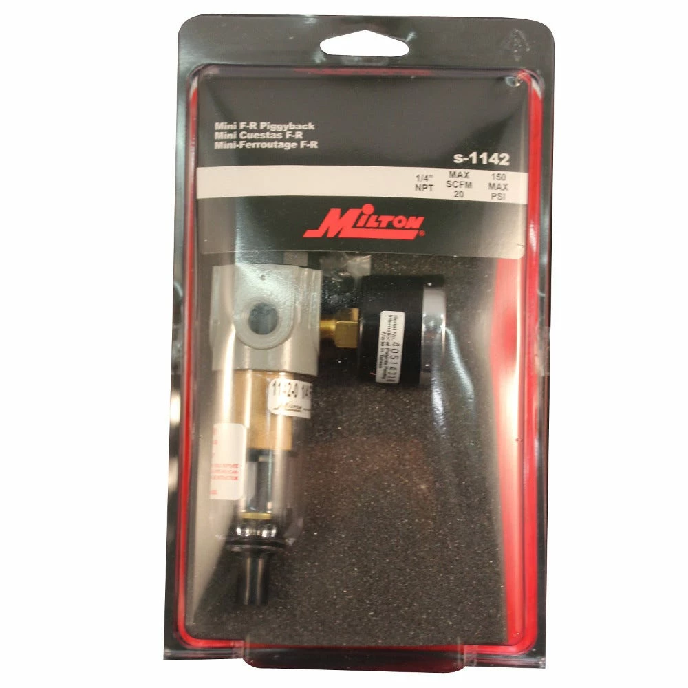 The Milton 1/4″ NPT Mini filter-reducer piggyback duo is recommended when space is a problem. Duo offers most of the same features as the full-size units. Pre-assembled with 0-160 PSI gage # 1189. Piggyback mini FR Duo is ideal for use in compact air flow applications. Maximum pressure 150 PSI and maximum SCFM of 21. Preassembled with Milton #1189 gage. Made in USA Yes Key feature Ideal for use in compact air flow applications NPT thread size 1/4″ NPT inlet Maximum PSI Max pressure 150 PSI Contents of part number Includes Milton #1189 gage