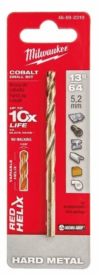 The MILWAUKEE RED HELIX Cobalt 13/64 in. Drill Bit are engineered for extreme durability and longer life in hard metal applications. The Milwaukee Cobalt drill bits are designed with a VARIABLE HELIX that includes an aggressive 35 degree Helix Angle which ends at 15 degree . The drill bits have QUADEDGE TIP to decrease heat buildup and drill faster. The 135 degree split point tip delivers a precision start and prevents walking for fast, accurate holes in Hard Metal, PVC and wood. The tapered drill bits feature a new ENHANCED TAPERED WEB that strengthens the bit’s core to increase flute durability. The cobalt twist drill bits are ideal for tough applications, providing up to 15X life vs. Black Oxide Drill Bits.