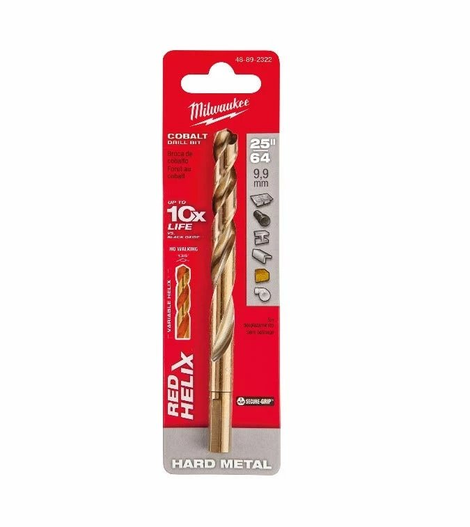 Milwaukee Cobalt Drill Bits with Red Helix are engineered with a Variable Helix that starts with an aggressive 35 degree cutting edge which ends at 15 degree providing Faster Material Removal. Aiding in material removal the Chip Breaker decreases the size of chips leading to less heat buildup to Stay Sharper Longer. The 135 degree split point tip delivers a precision start and prevents walking for fast, accurate holes. Cobalt is ideal for Hard Metal applications to give you up to 10x life versus Black Oxide Drill Bits but can be used in all applications.