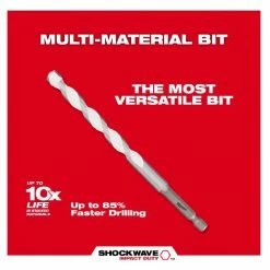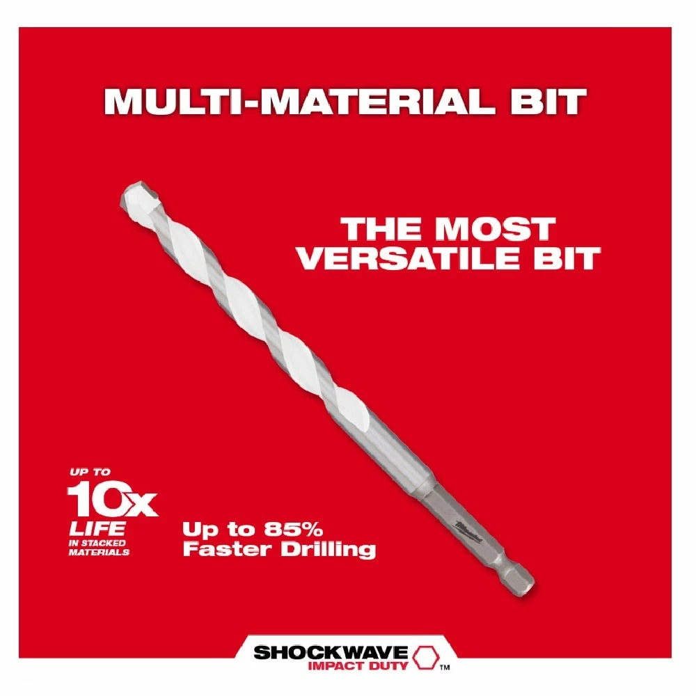 Milwaukee 3/16 in. SHOCKWAVE Carbide Multi-Material Drill Bits are the most versatile bits, designed to tackle a variety of materials, including brick, block, concrete, steel, aluminum, ceramic tile, backerboard, wood, PVC and drywall. The aggressive multi-grind carbide tip delivers up to 10X longer life in stacked materials and up to 85% faster drilling speeds in metal. Equipped with a 1/4 in. hex shank, these all-purpose drill bits are compatible with impacts, drill/drivers and hammer drills. These Milwaukee general-purpose drill bits provide the ideal all-in-one solution for the widest variety of materials, tools and applications.