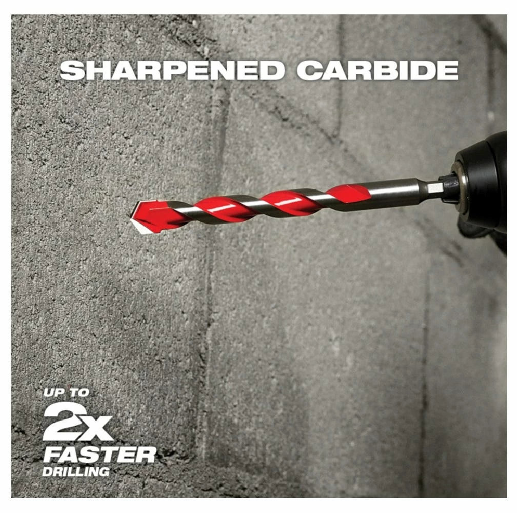 The MILWAUKEE® 3/4″ x 10″ x 12″ Carbide Hammer Drill Bit uses sharpened carbide to deliver up to 5x longer life in concrete and up to 2x faster drilling into masonry material. Engineered with a precision ground tip, these Milwaukee drill bits deliver faster starts and less walking in concrete, brick, and block. The wide flute design removes dust faster, reducing heat and delivering more holes per charge. These bits feature a 3-flat shank for better grip and control. The extended life of the Milwaukee Carbide Hammer Drill Bits provides the ideal solution for drilling in masonry materials with cordless and corded hammer drill/drivers.