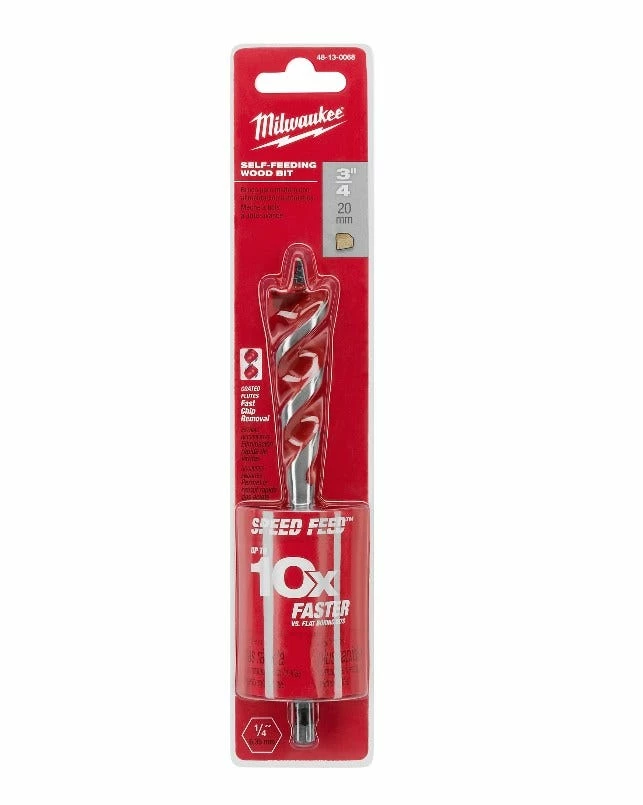 Milwaukee® 3/4 in. x 6 in. SPEED FEED™ wood bits let you drill up to 10X faster than flat boring bits. These self-feeding wood bits feature double wing spurs for drilling fast holes in clean wood. The feed screw and dual cutting edges permit fast cutting of clean holes that are ideal for feeding wire or bolts.