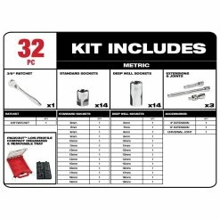 32-piece 3/8 in. drive metric ratchet and socket set (48-22-9508). Sockets: 10 mm Deep, 10 mm, 11 mm Deep, 11 mm, 12 mm Deep, 12 mm, 13 mm Deep, 13 mm, 14 mm Deep 14 mm 15 mm Deep, 15 mm, 16 mm Deep, 16 mm, S17 mm Deep, 17 mm, 18 mm Deep, 18 mm, 19 mm Deep, 19 mm, 6 mm Deep well socket, 6 mm, 7 mm Deep, 7 mm, 8 mm Deep, 8 mm, 9 mm Deep, 9 mm, universal hose adapter, 3 in. extension, 6 in. extension, 90-Tooth 3/8 in. Drive Ratchet, PACKOUT compact organizer (48-22-8436)