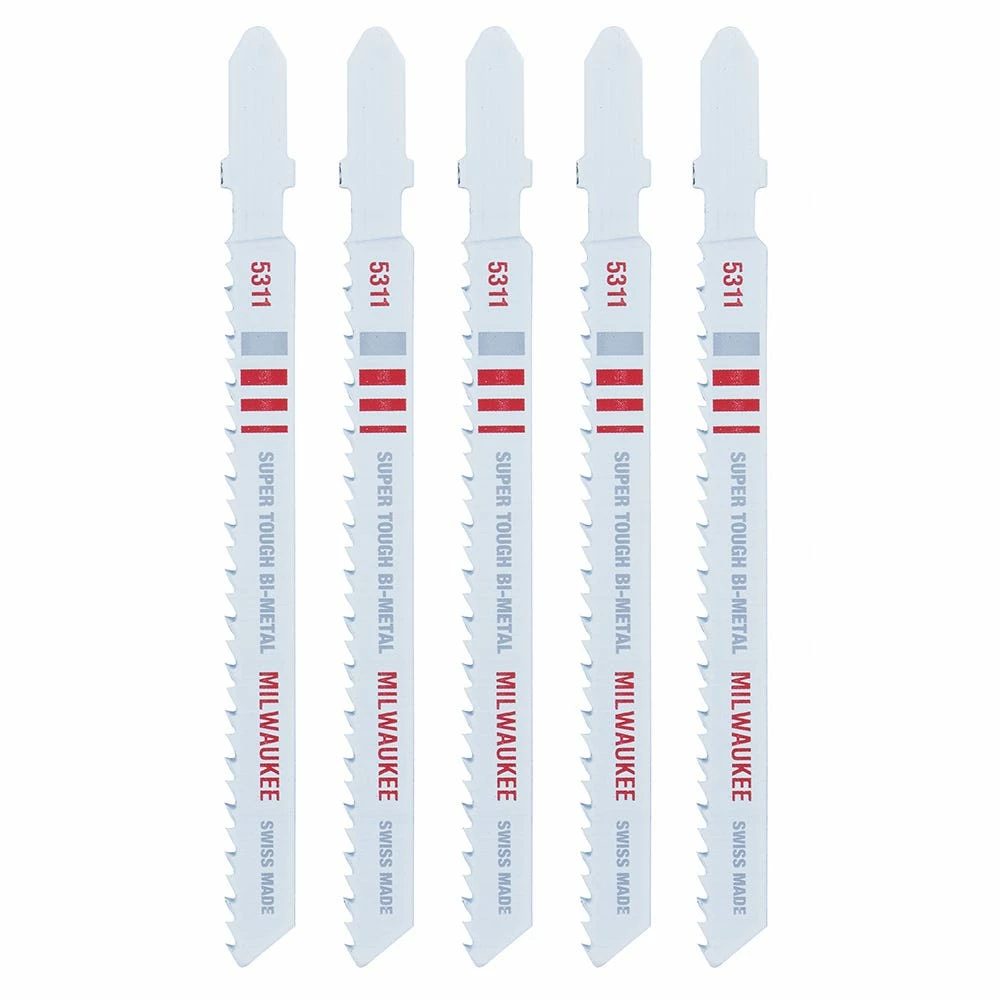 Milwaukee T-Shank Bi-Metal Jig Saw blades are designed and manufactured for the professional user. Bi-metal blades last longer than high speed steel or carbon blades. Detail to the material used, tooth shape and sharpness make these blades cut clean, fast and have a longer life. This blade has uses T-Shank and fits Milwaukee Jig Saws 6266-6, 6276-6, 6267-20, 6267-21 and other popular brands. Includes 5 individual blades.