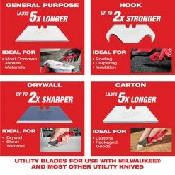 Milwaukee Carton Utility Blades are designed to minimize risk of cutting injury and protect contents in cartons and packaged goods. Milwaukee utility blades are engineered to fit Milwaukee and most standard utility knives. Heavy duty blades.