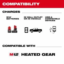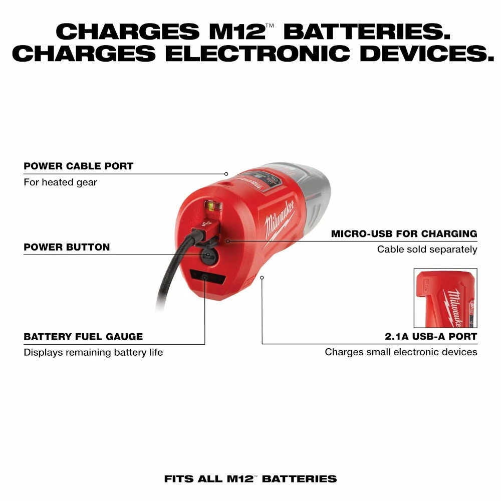 - Compatible with all models of M12 heated gear to provide power to gear, portable charging of M12 batteries and device charging functionality