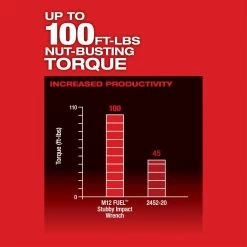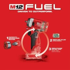 The M12 FUEL Cordless Brushless 1/4 in. Stubby Impact Wrench is the industries most compact impact wrench on the market place. Measuring only 5.1 in. in length, this tool fits in tighter spaces, making users more productive. Increased torque delivers an industry leading 100 ft.-lbs. of breakaway torque, removing even the most stubborn bolts and fasteners. 4-Mode Drive Control, will allow unmatched control in various fastening applications. 1-3 RPM allows for precision control, and Auto-Shut Off Mode in the 4th setting will prevent over fastening of bolts while doing reassembly work.