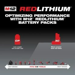 The Milwaukee M12 REDLITHIUM XC6.0 Battery Pack delivers up to 3x more runtime, 20% more power and 2x more recharges than standard lithium-ion batteries. The lithium-ion battery pack features superior pack construction, electronics, and performance providing users more work per charge and more work over pack life than any battery on the market. The rechargeable battery also delivers users with 5.0 Amp-hours of runtime. Each battery pack is durably built for heavy-duty use, runs cooler, and performs in climates below 0 degree F/minis 18 degree C. Its compact, lightweight design allows users to work in tight work spaces and reduces fatigue. Built-in REDLINK Intelligence protects the battery from overloads, preventing users from damaging their cordless power tools in heavy-duty situations, while the discharge protection prevents cell damage. An integrated temperature Management system and individual cell monitoring help to maximize battery life. Switch to Milwaukee’s REDLITHIUM XC6.0 Battery Pack to instantly upgrade the runtime and durability of Milwaukee M12 cordless tools.