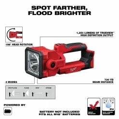 Spot Further, Flood Brighter. The M18 Search Light gives users versatility, performance, and durability all in one light. It’s pivoting head provides 1,250 lumens and over 700 yards of beam distance to spot objects and areas at a far distance. The search light has 4 output modes: spot mode, flood mode, spot/flood mode, and strobe mode, which allow the user to spot from a far or flood an area up close. The M18 Search Light can run for up to 4 hours on flood mode and spot/flood mode with an M18 REDLITHIUM XC 5.0 Battery Pack, and 6 hours on spot mode and 5 hours on strobe mode. Its IP54 rating provides water and dust resistance for all weather use. It’s high-quality LEDs never need to be replaced, and is back by a limited lifetime warranty.
