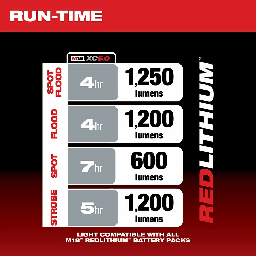 - Spot/Flood Combination mode: 4hrs with M18â„¢ XC 5.0 pack