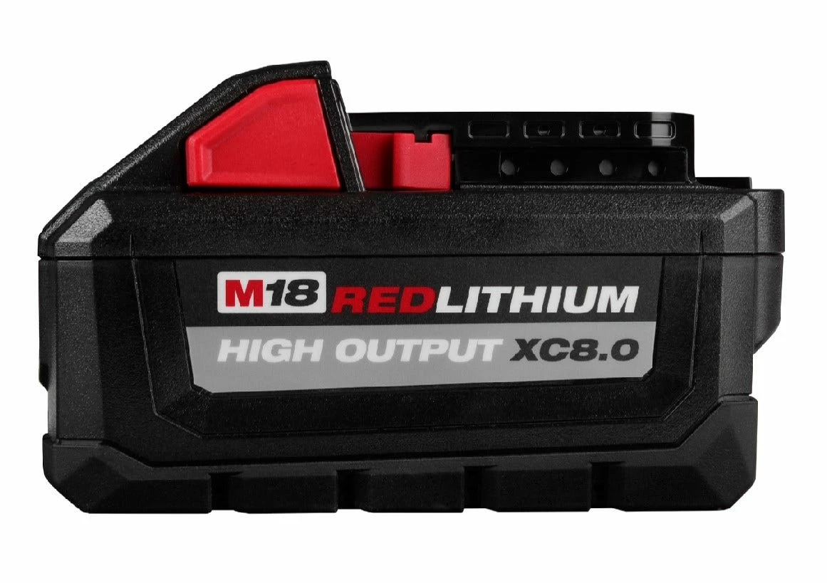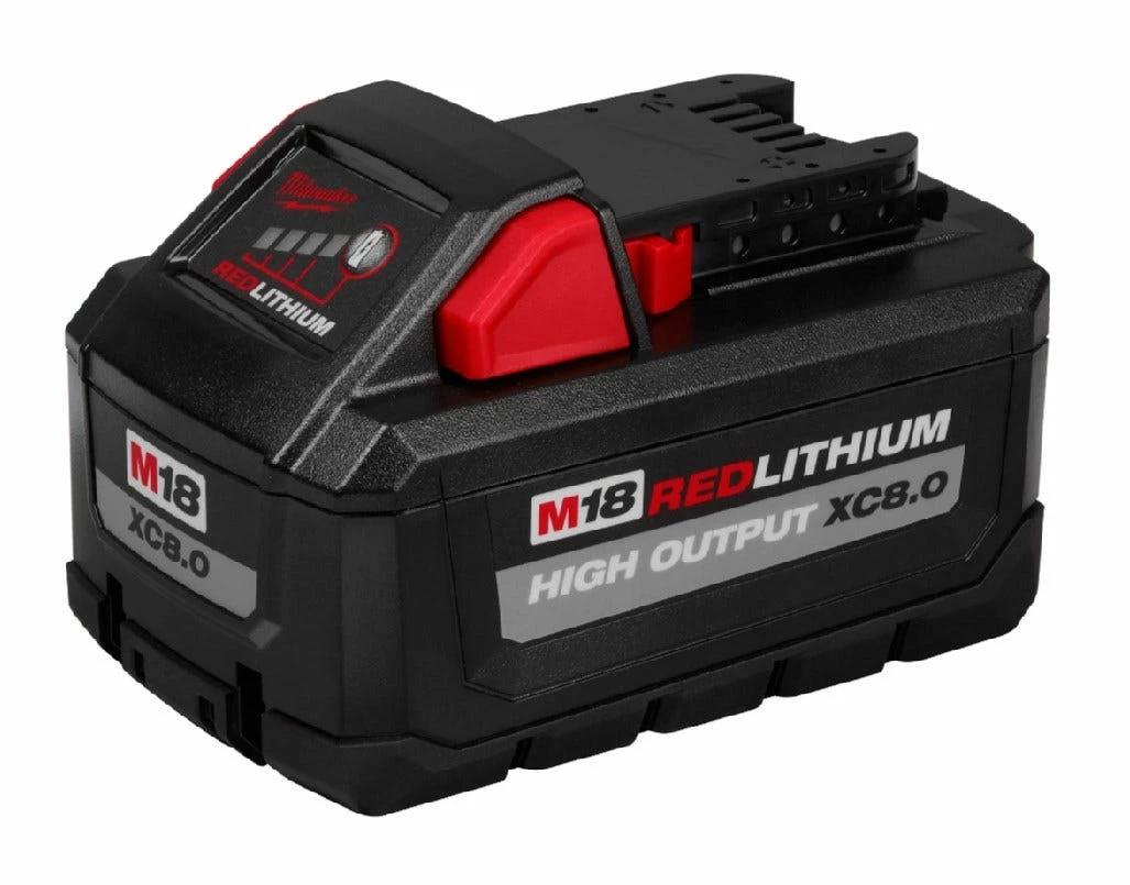 The M18™ REDLITHIUM™ HIGH OUTPUT™ XC8.0 Battery Pack provides you with 50% more power and runs 50% cooler vs our other M18™ REDLITHIUM™ XC battery packs. The optimized combination of smaller size and increased power of the 18-volt battery provides you with a great solution for the entire range of M18™ products. The lithium-ion battery delivers fade-free power and runs substantially cooler through heavy applications, allowing you to push your cordless power tools throughout a wide application range. The M18™ XC8.0 battery provides you with increased power in extreme-cold weather conditions (below 0F / -18C) and delivers more work per charge, driving corded replacement. The REDLITHIUM™ HIGH OUTPUT™ XC8.0 extended capacity battery is fully compatible with all 175+ Milwaukee® M18™ solutions.